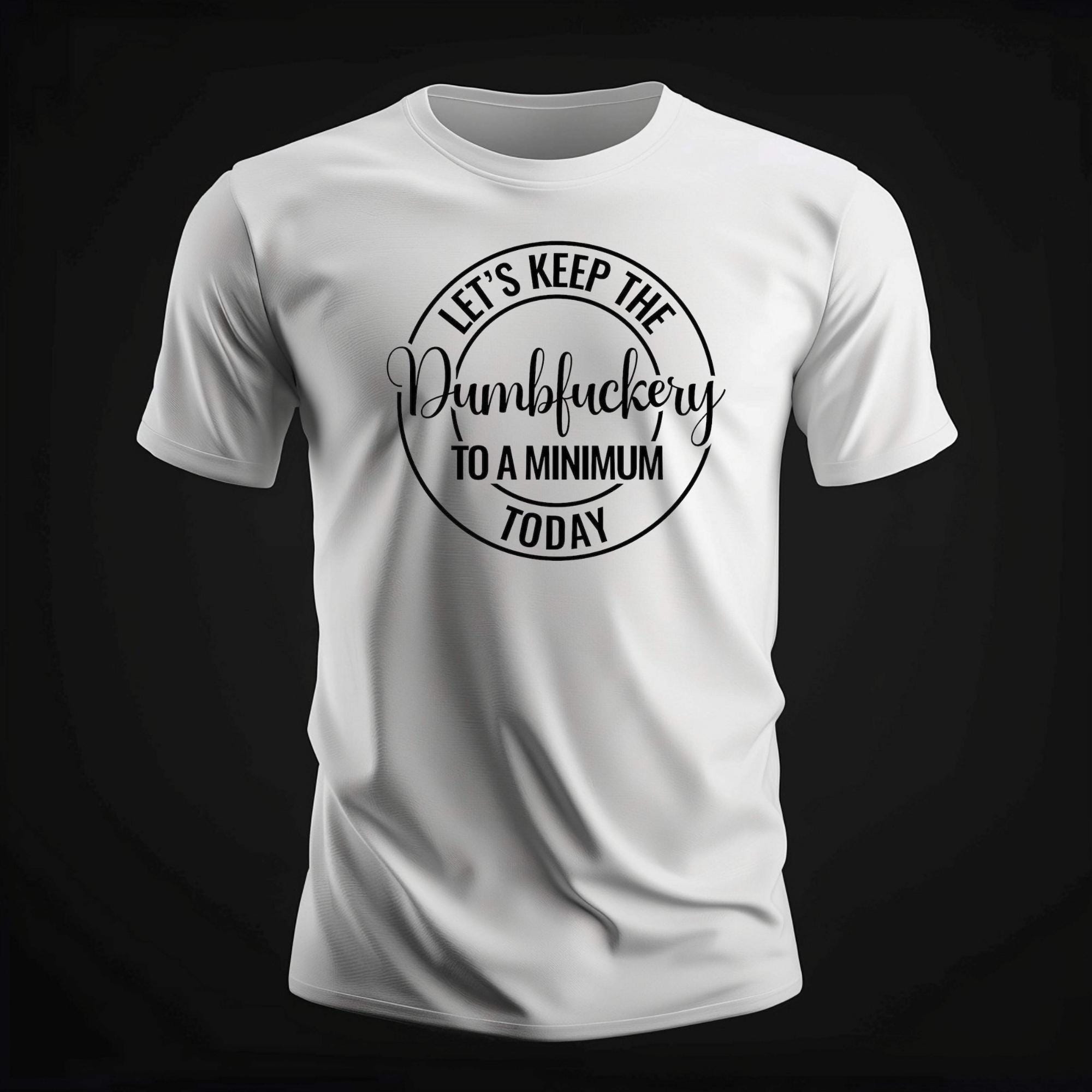 Some days call for caffeine. Others call for boundaries. This shirt delivers both—with a side of sarcasm. Featuring a clean white base and a circular statement that says what everyone’s thinking but won’t say out loud: *“Let’s Keep the Dumbfuckery to a Minimum Today.”*